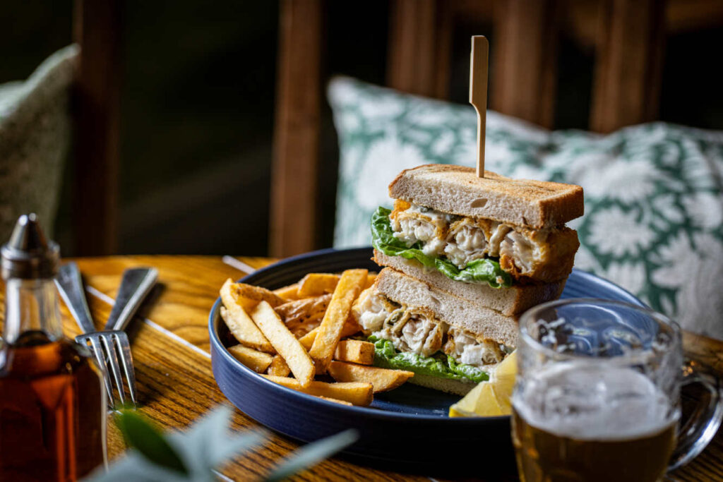 Beer-battered fish fingers, tartare sauce, toasted farmhouse bloomer (†) | 9.50 1087 kcals