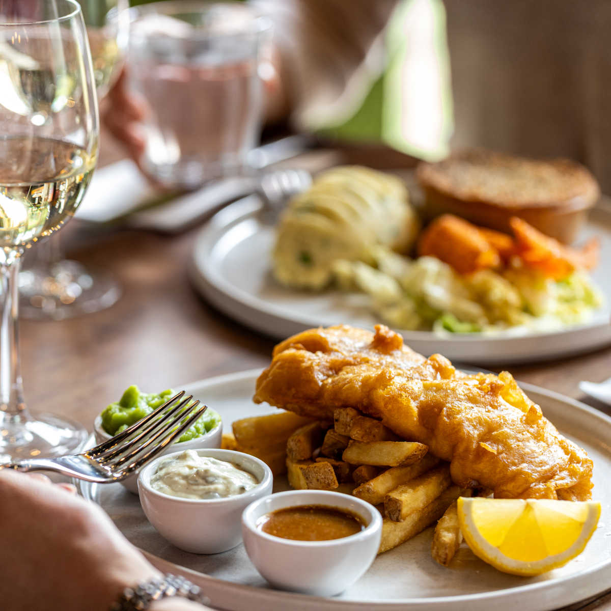 Beer-battered fish and chips, tartare sauce with a choice of garden or mushy peas (†) | 13.50 1185 kcals