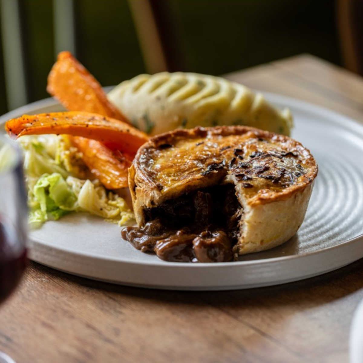 Mushroom bourguignon pie, roast potatoes, green cabbage, peas, leeks, roasted carrots, gravy (ve) | 13.95 1057 kcals
