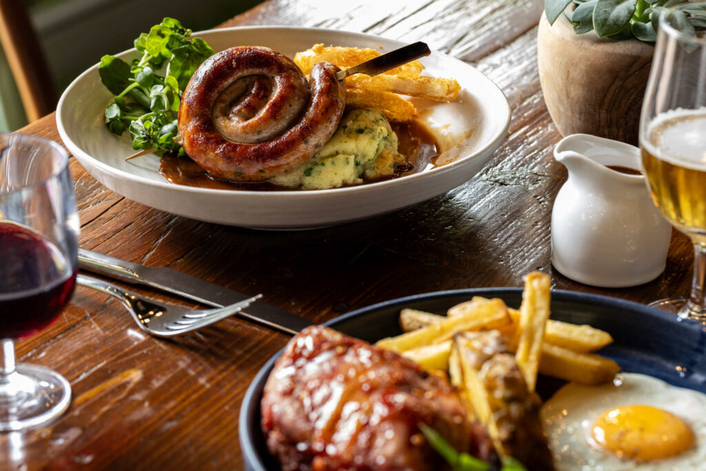 Cumberland sausage ring, herby mash, beer-battered onion rings, gravy 927 kcals