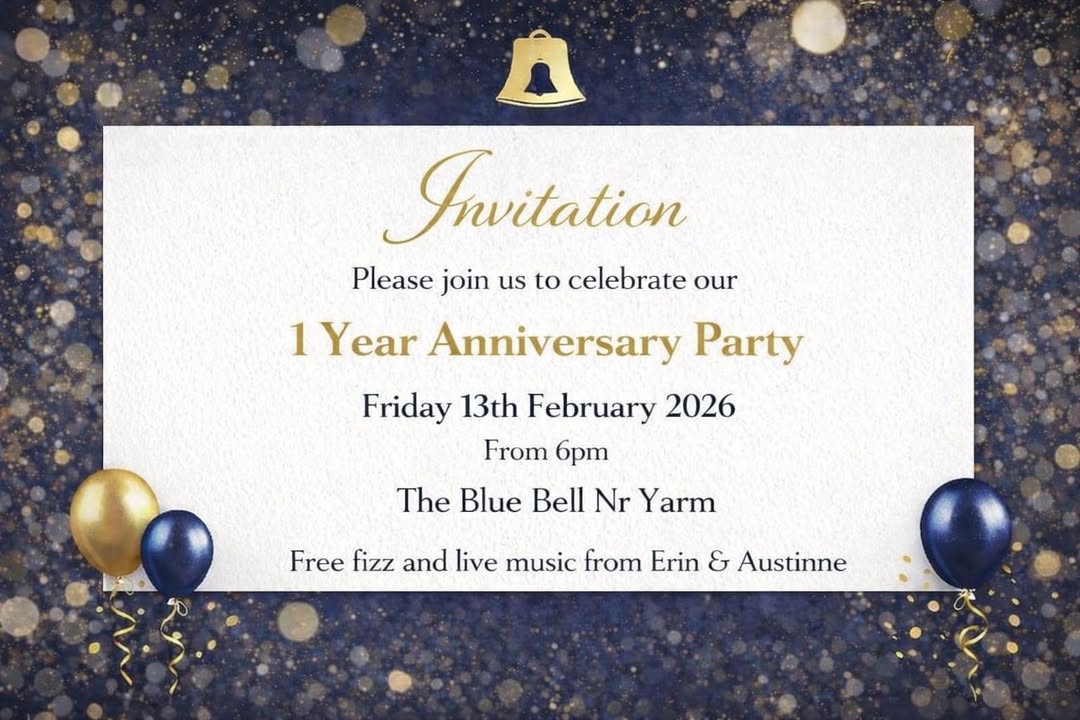 It’s Our Anniversary Today ! 😀🎉🥳🍾 Yes folks it is ONE YEAR since we took over and reopened the Blue Bell and we think that’s a great reason for a party! Naturally we’d love you to join us so make sure you come down tonight as we’re partying from 6pm with free fizz and live music from Erin & Austinne ! 🥂🕺💃🎶 Here’s your invitation! See you here! Alison, Matt and the Team The Blue Bell, Nr Yarm.