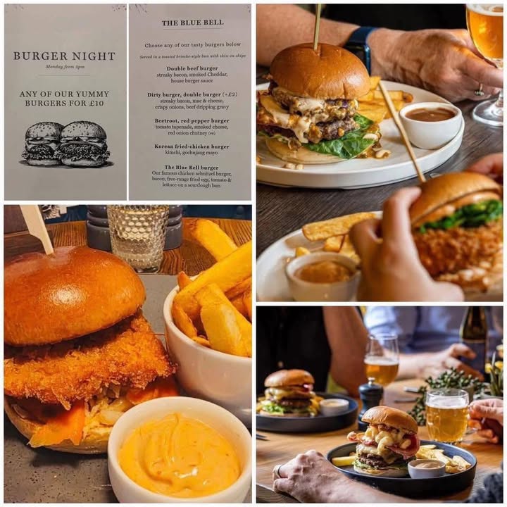 🍔 Burger Night Tonight @ The Blue Bell 🍔 Mondays don’t have to be boring… especially when Burgers are involved 😉✨ Join us from 5pm and tuck into any of our delicious handcrafted burger meals for just £10 — all served in a soft brioche-style bun with crispy skin-on chips on the side. Classic favourite? Loaded and indulgent? Veggie? 🤔 - The toughest part is choosing which one to go for first… 😋 Round up your burger-loving mates, bring your appetite and make Monday something to look forward to! Check out the full line-up here 👇🏻 https://www.bluebellatyarm.com/food/ Alison, Matt and the Team The Blue Bell, Nr Yarm