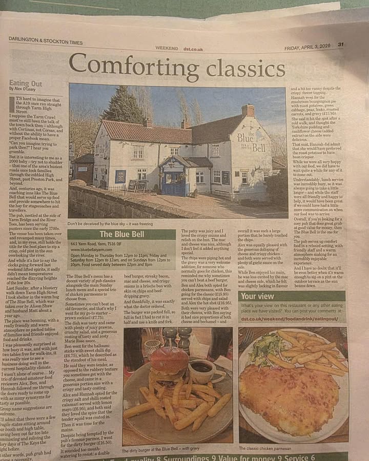 Sunday Lunch At The Blue Bell 🍽️✨ Thinking about a proper Sunday treat this weekend ? 🤔 Join us for a relaxed afternoon with a great choice of roasts, all the trimmings, and plenty more to tempt you… including our ever-popular Parmos 😍 We’re busy most Sundays now, so booking ahead is definitely the way to go! Take a look at the menu and reserve your table here 👇🏻 https://www.bluebellatyarm.com Families are always welcome, and we’ve got high chairs ready for the little ones too 👨👩👧👦 We are also taking bookings for Easter Sunday now too…😀 Alison, Matt and the Team The Blue Bell, Nr Yarm